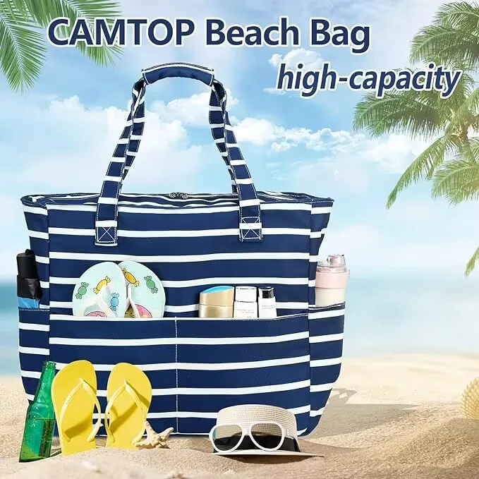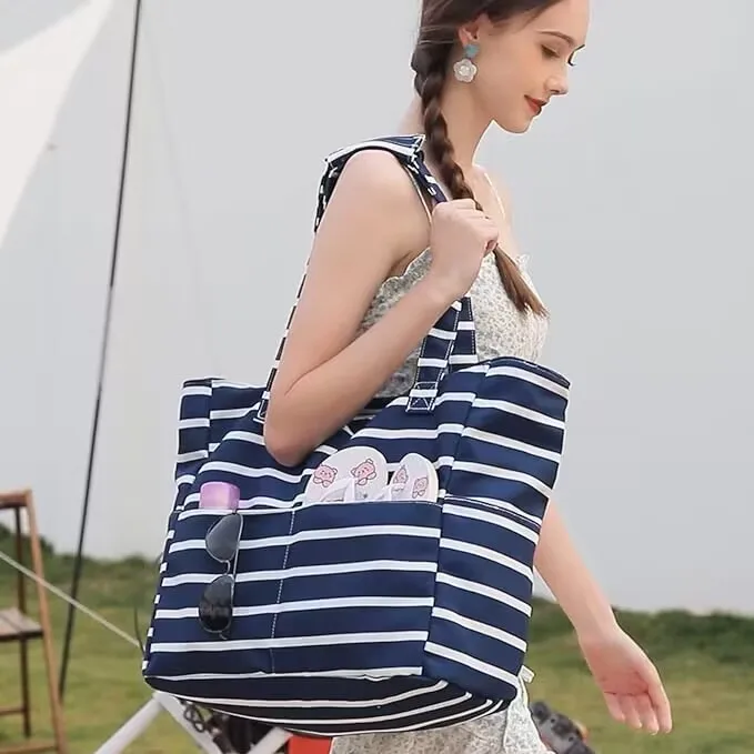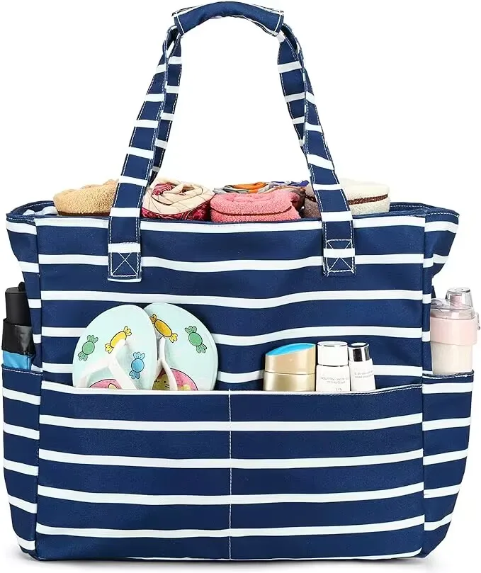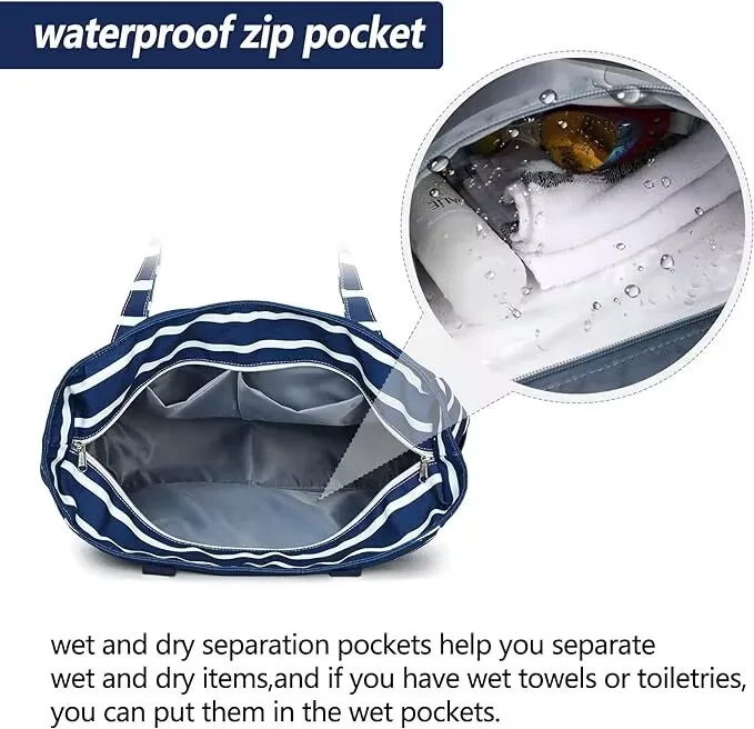 Women's Portable Large Summer Tote Bag Waterproof Blue White Stripe Dry Wet Separation Beach Gym Travel for Pool